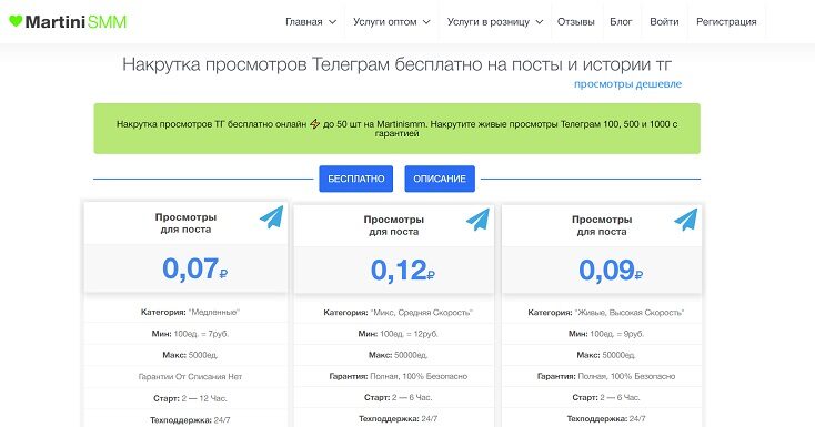 martinismm. На этом ресурсе предлагают накрутить просмотры до 10К в Телеграмме бесплатно или совсем дешёво. В бесплатном варианте можно получить от 10 штук до 50 глазков в день, просто нажав на соответствующую клавишу на сайте и заполнив заявку для получения актива. Платная накрутка здесь представлена по цене от 7 рублей за тысячу штук. Сайт даёт 100% гарантию безопасности накрутки, так как трафик используется здесь живой и проверенный, а добавление его в канал производится безопасными способами.