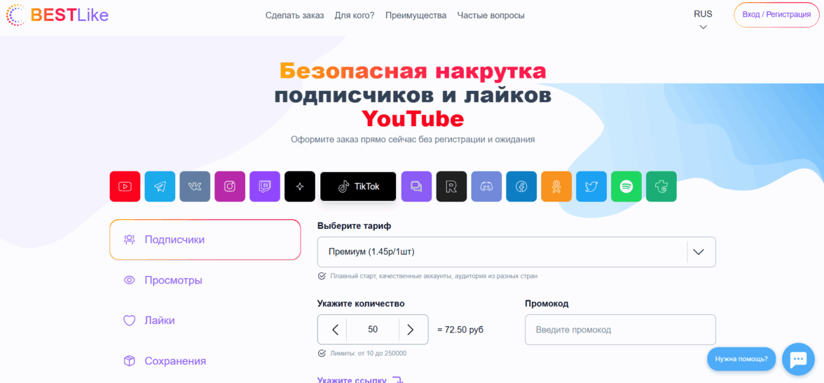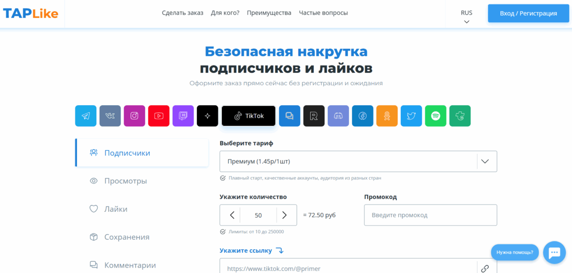 Универсальная платформа для продвижения, которая работает не только с TikTok, но и с другими популярными социальными сетями. Сервис предлагает накрутку лайков, подписчиков, комментариев, репостов и просмотров. Интерфейс прост и удобен, а оформление заказа занимает не более нескольких минут. Круглосуточная поддержка гарантирует оперативное решение любых вопросов.