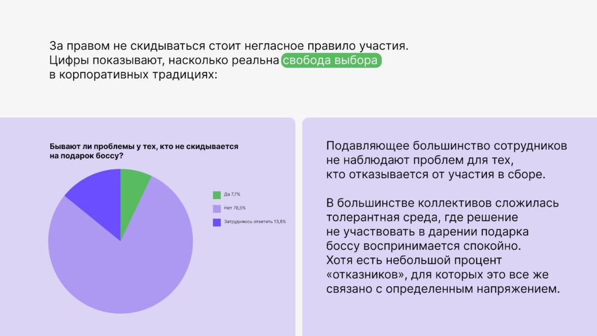Наше исследование показывает удивительный парадокс. С одной стороны 78% респондентов заявляют, что к тем, кто не хочет скидываться на подарок в коллективе относятся совершенно нормально. Казалось бы, большинство демонстрирует толерантность и понимание. Однако за этими позитивными показателями скрывается иная реальность: 7% работников сталкивается с вполне конкретными последствиями своего решения — от косых взглядов до открытого осуждения.