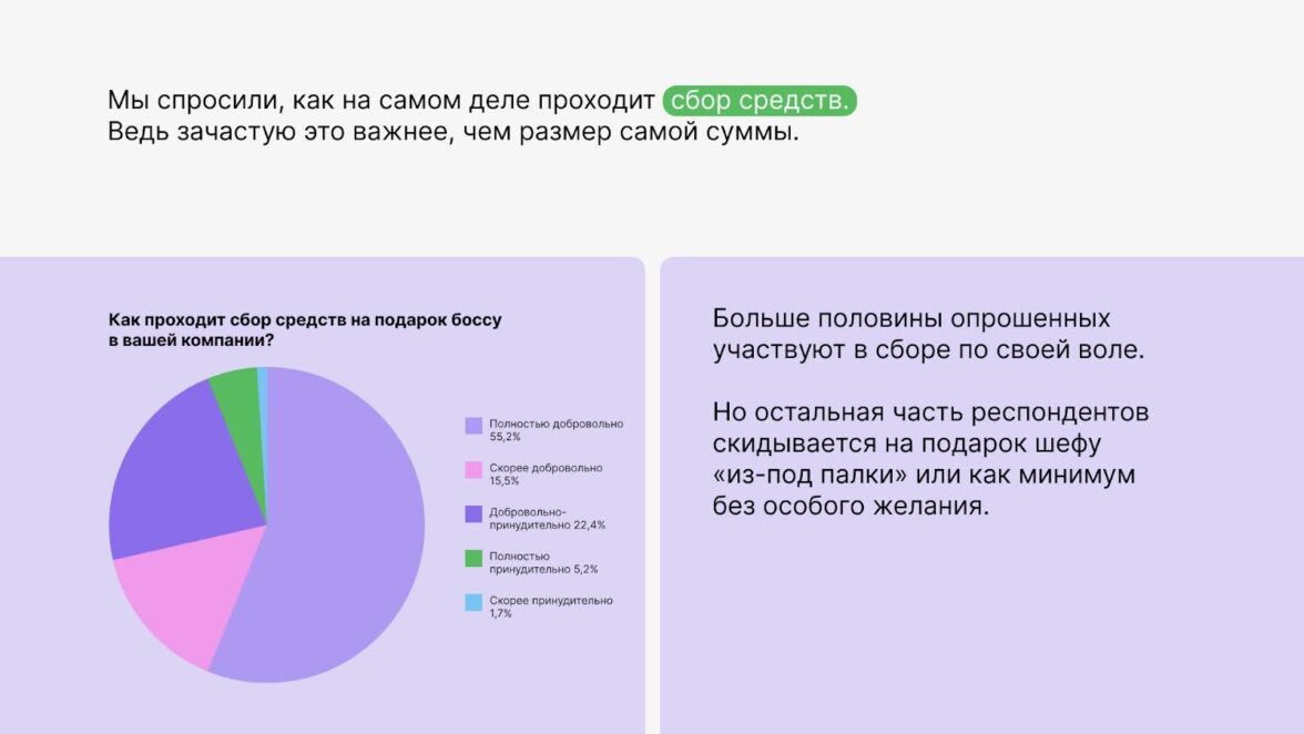 За внешней добровольностью процесса часто скрывается сложная паутина негласных правил и ожиданий. Данные исследования говорят о том, что 16% опрошенных честно признаётся, что участвует в сборах на подарок руководителю под давлением. Не из радости, не от избытка чувств, а потому что чувствует — неучастие может дорого обойтись.