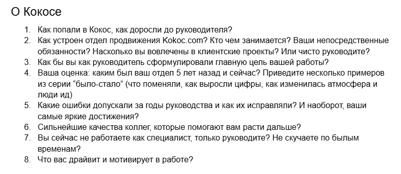 В результате каждый герой интервью получает 15-20 проработанных индивидуальных вопросов. Мы даем время подготовиться — никаких сюрпризов, все комфортно и удобно герою.