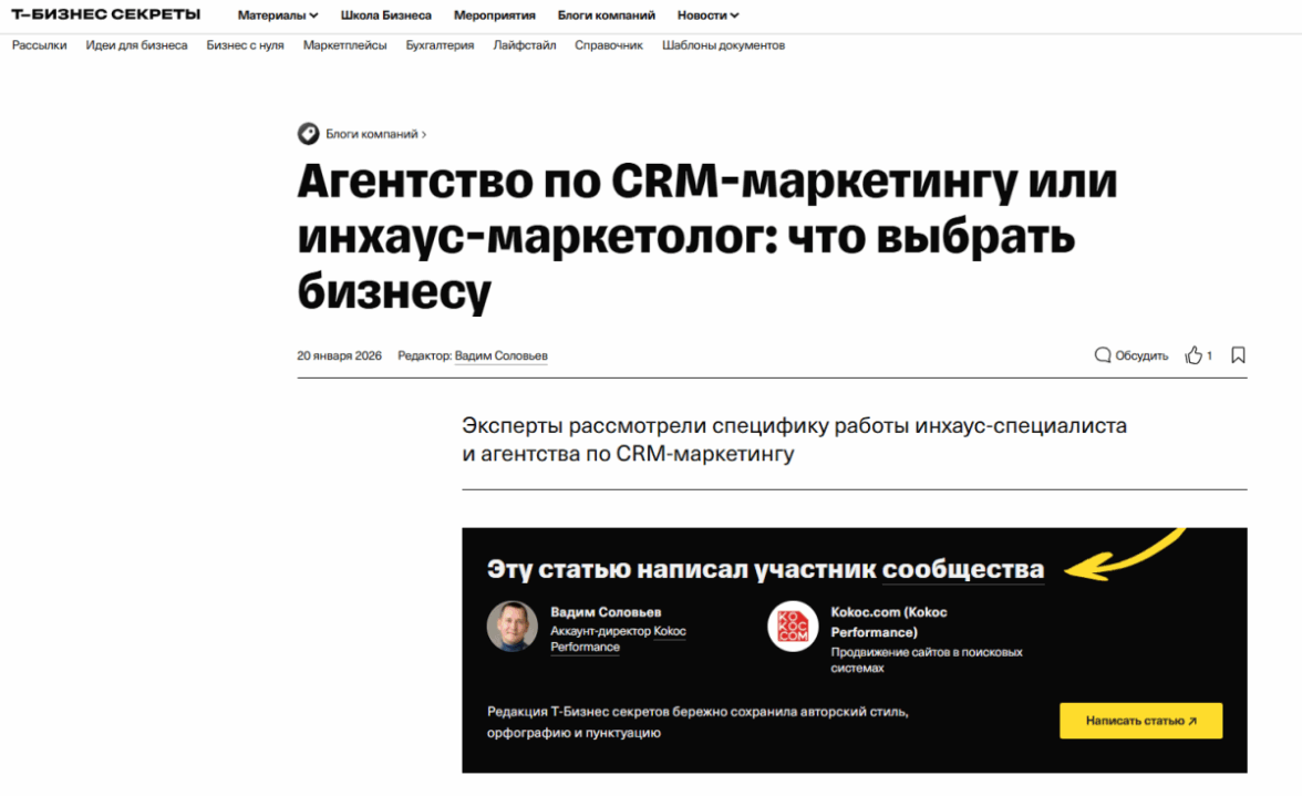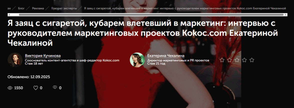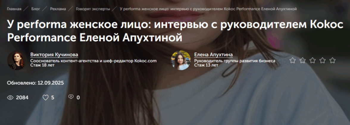 С Kokoc Performance (входит в Kokoc Group) мы работаем с 2021 года. Составили контент-стратегию, развили блог с нуля, наладили систему дистрибуции контента. Вырастили трафик в блог в 241,2 раза, конверсии в 16,5 раз — об этом есть подробный кейс https://itiriy.ru/keisy/delaem-kontent-marketing-dlya-agentstva-kokoc-com/.