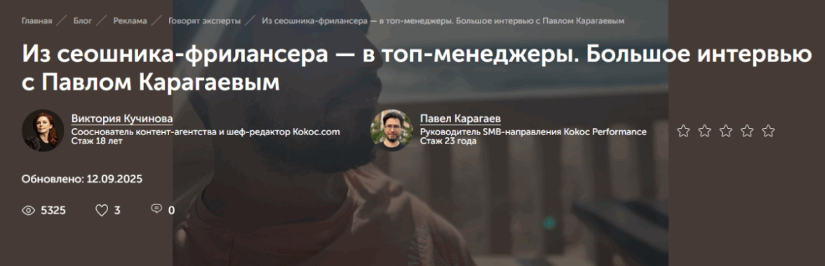 Также нам важно показать человека как эксперта в своей отрасли. Руководителя отдела SEO Kokoc Performance Сергея Шабурова мы спросили о SEO: