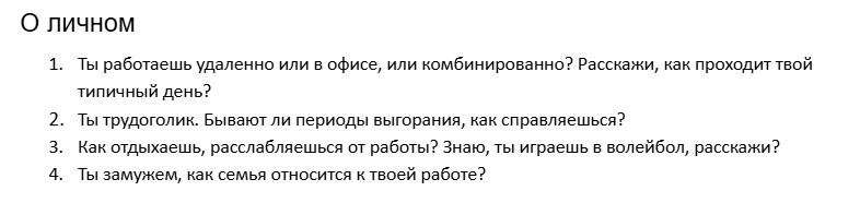 Однако даже в бизнес-интервью недостаточно говорить только о бизнесе. Человек интересен своей историей, а это не только работа, но и личная жизнь.