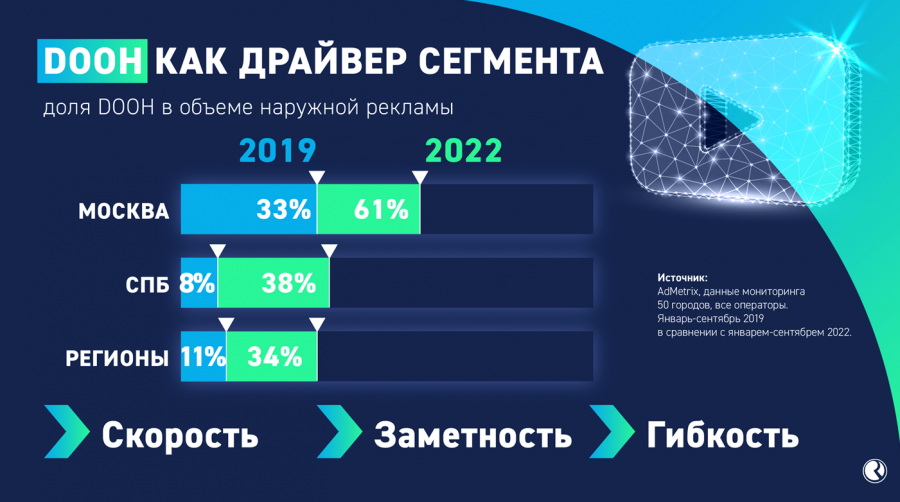 Представители Russ Outdoor подчеркнули, что локомотивом роста рынка остается цифровая наружная реклама. Так, доля цифровых носителей в Москве в 2022 году составила 61%, продемонстрировав почти двукратный рост по отношению к 2019 году. В регионах рост еще выше, что объясняется эффектом низкой базы: в этом году доля на цифровые носители пришлось 34% рынка — втрое больше, чем в 2019-м. Группа прогнозирует, что на фоне сокращения объема доступного инвентаря в интернете, доля наружной рекламы среди других медиаканалов в 2023 году вырастет.