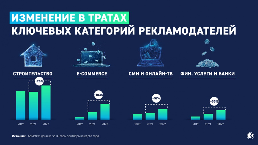 С начала украинского кризиса структура рекламодателей в наружной рекламе заметно изменилась. По данным Russ Outdoor, лидером вложений в наружную рекламу стали представители категории «электронная коммерция», расходы которых за прошедшие три квартала 2022 года увеличились на 103% по сравнению с аналогичным периодом прошлого года. Второе место с ростом 59% заняли СМИ и онлайн-ТВ, на третьем — банки и финансовые организации, прибавившие 55% к бюджетам 2021 года. Затраты также увеличили компании строительного сектора (+26%) и бренды туристической отрасли и развлечений (+9%). Меньше всего денег за первые девять месяцев 2022 года потратили компании сектора услуг связи: их расходы сократились на 5%.