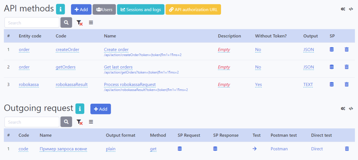 C исходящими запросами все немного сложнее. Сначала нужно подготовить запрос к внешней стороне (это одна хранимая процедура — request), а затем обработать ответ от внешней стороны (это другая хранимая процедура — response).