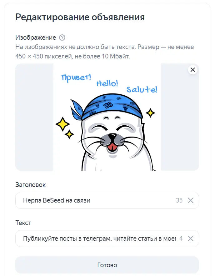В конструкторе объявлений можно автоматически выбрать то, что предложил Яндекс.Директ или внести корректировки в изображения и текст, а также добавить посты из прикрепленного Telegram-канала.