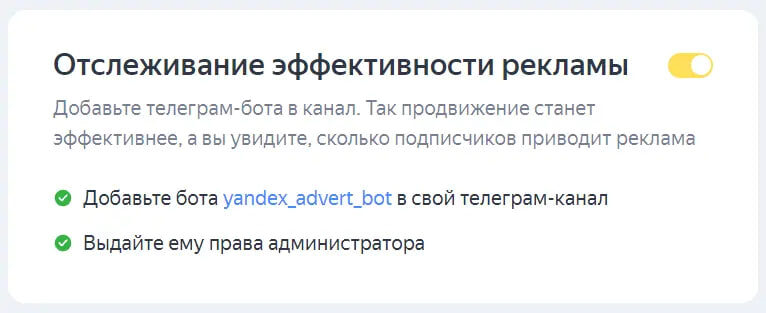 Для отслеживания эффективности такой рекламной кампании нужно добавить бота Яндекс.Директа в свой Telegram-канал и наделить его правами администратора. Благодаря этому продвижение станет эффективнее и можно будет отследить, сколько подписчиков прибавилось благодаря рекламе. Именно здесь Яндекс нас и обманул — об этом в конце.