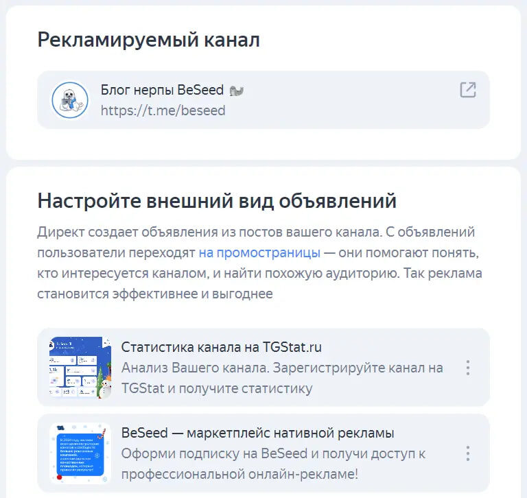 Мы вставили ссылку на канал, а платформа загрузила существующие посты и сформировала рекламные объявления.