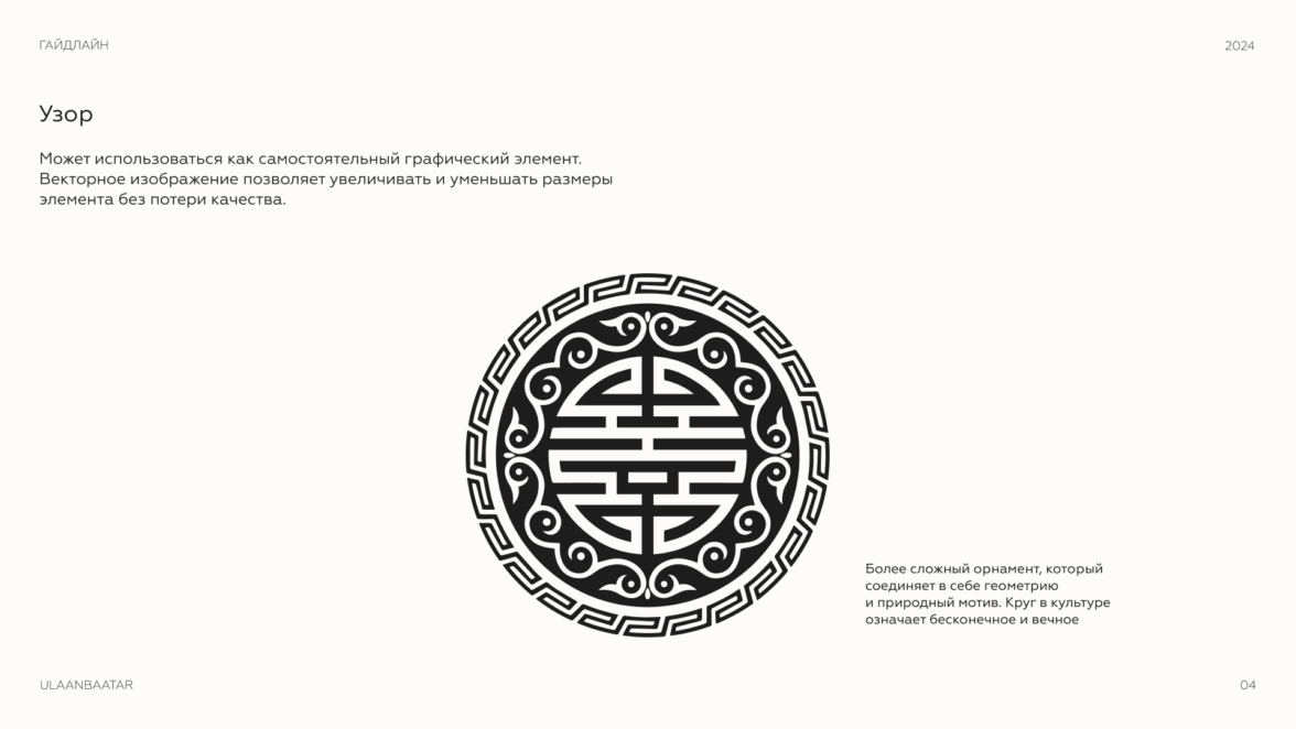 Круглый орнамент объединяет природные и культурные мотивы Монголии. Визуально он добавляет аутентичности и выделяет бренд среди конкурентов.