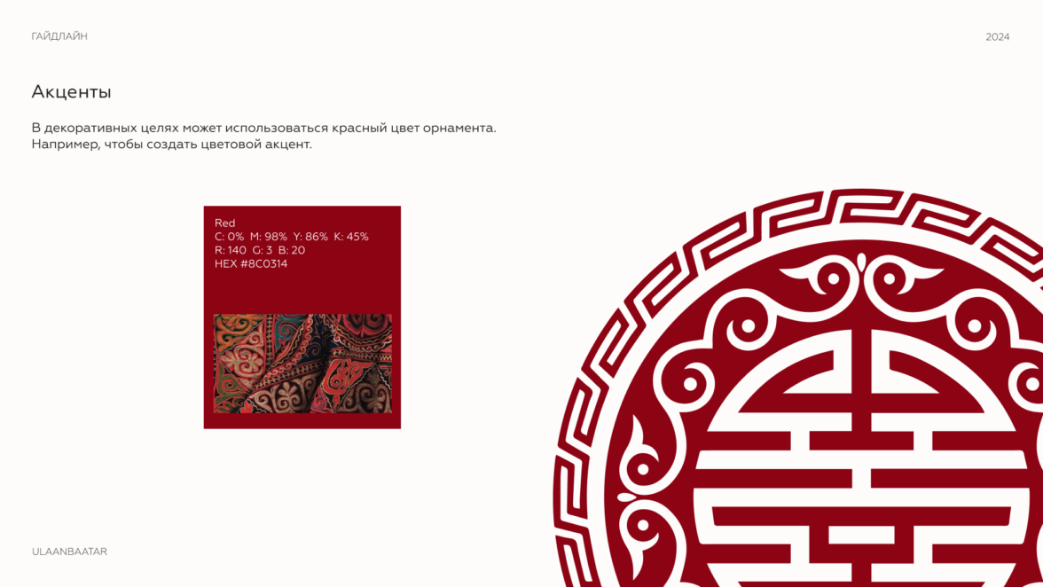 Красный применяется для создания декоративных акцентов, подчеркивающих уникальность дизайна. Этот цвет встречается на традиционных монгольских тканях и символизирует богатство и силу.