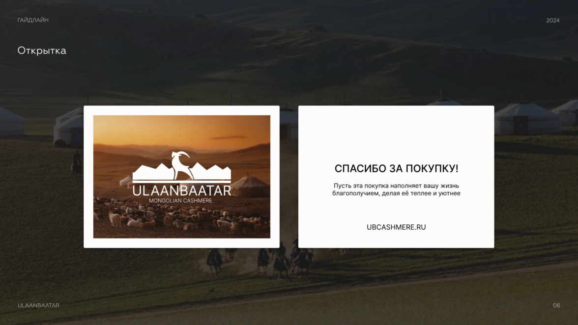 Фирменный стиль ULAANBAATAR передает ценности бренда: натуральность, качество, открытость и традиции. Каждая деталь концепции воплощает в себе смыслы из бренд-платформы.