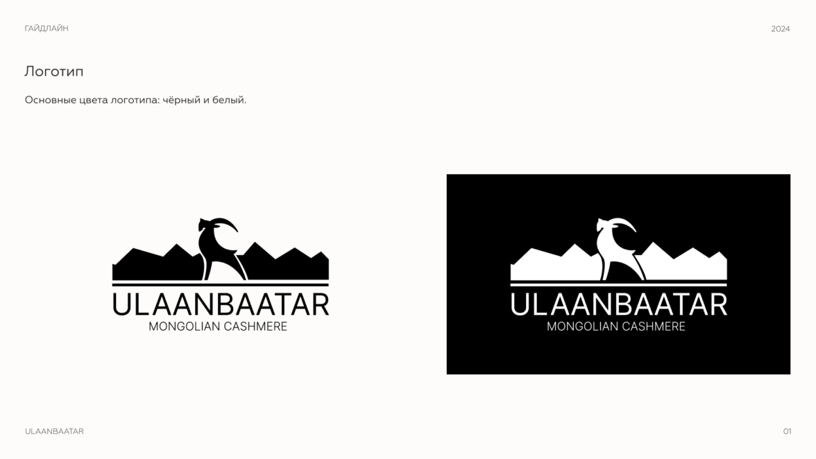 У клиента уже товарный знак и логотип, который он пожелал оставить. Это черно-белый логотип, который отражает минимализм и УТП бренда. Образ горного козла и силуэт гор подчеркивают монгольское происхождение кашемира и связь с природой.