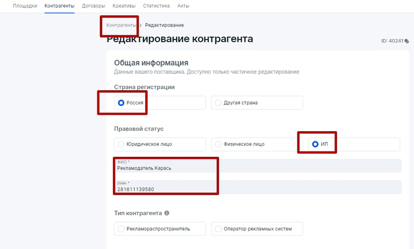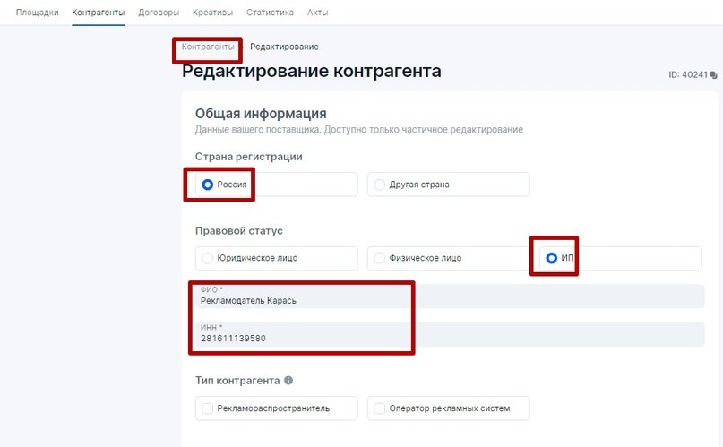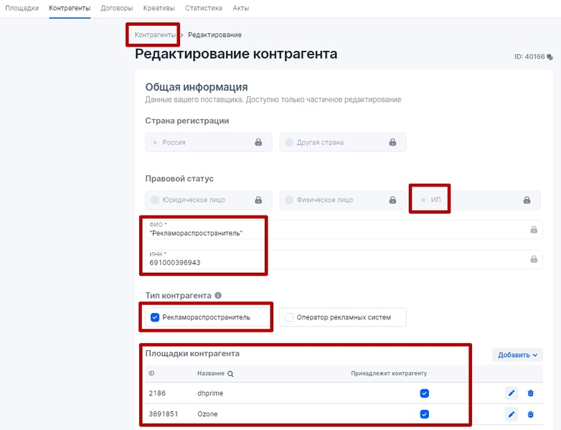 РР заполнит информацию о себе, поставит галочку Рекламораспространитель и прикрепит интернет-площадки, которые ему принадлежат.