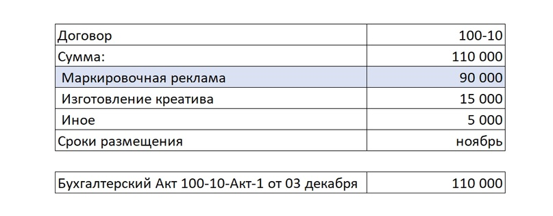 Изначально предположим, что между Рекламодателем и РР есть договор 100–10 от 20 октября на размещение рекламных материалов в ноябре 2023 года и дополнительным работам по договору (креатив и иные виды услуг). По окончании размещения РР (блогер) выставит для Рекламодателя бухгалтерский (бумажный акт) от 03 декабря 2023 года на общую сумму работ по договору.