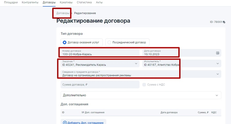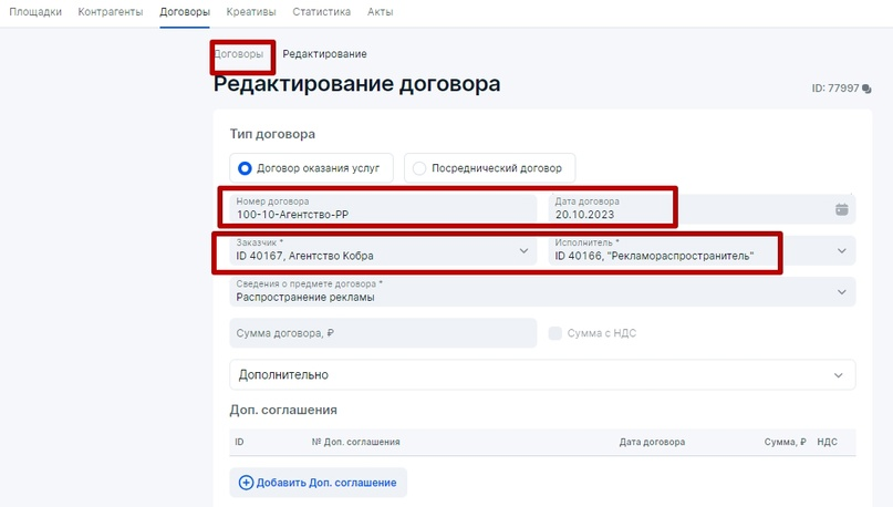 Важно: прикрепление креативов в блоке Креативы всегда производится к Изначальному договору (договор между Рекламодателем и его первым контрагентом). В нашем случае, при короткой рекламной цепочке, Изначальный договор и договор РД-РР это одно и то же, поэтому в блоке Креативы указан наш договор № 100–10 от 20 октября 2023 года (он автоматически появится в меню поля при выборе).
