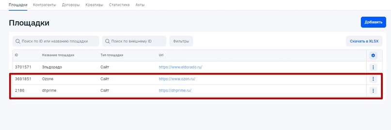 РР (блогер) в своем ОРД, в котором он предварительно зарегистрировался и получил аккаунт (ОРД Озон в нашем случае), должен указать свою интернет-площадку в блоке Площадки, где будет происходить размещение РИМ. Допустим, блогеру принадлежат две площадки в интернете для того, чтобы показать принцип, как будут распределяться рекламные бюджеты в блоке Статистика.
