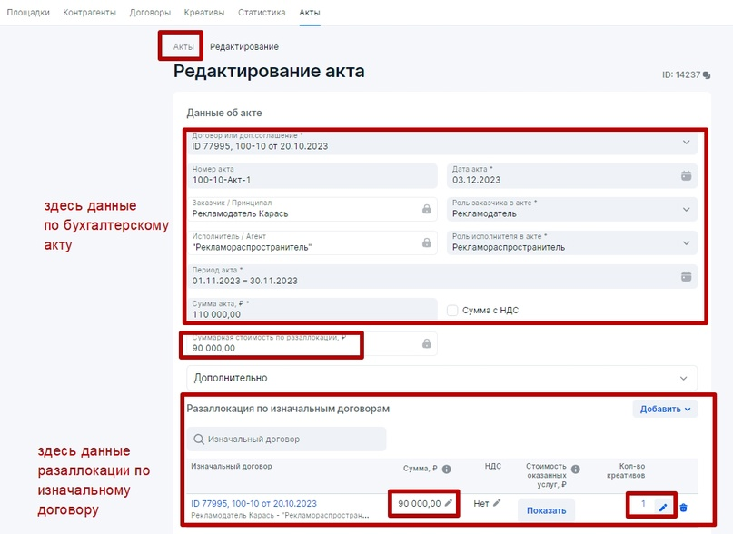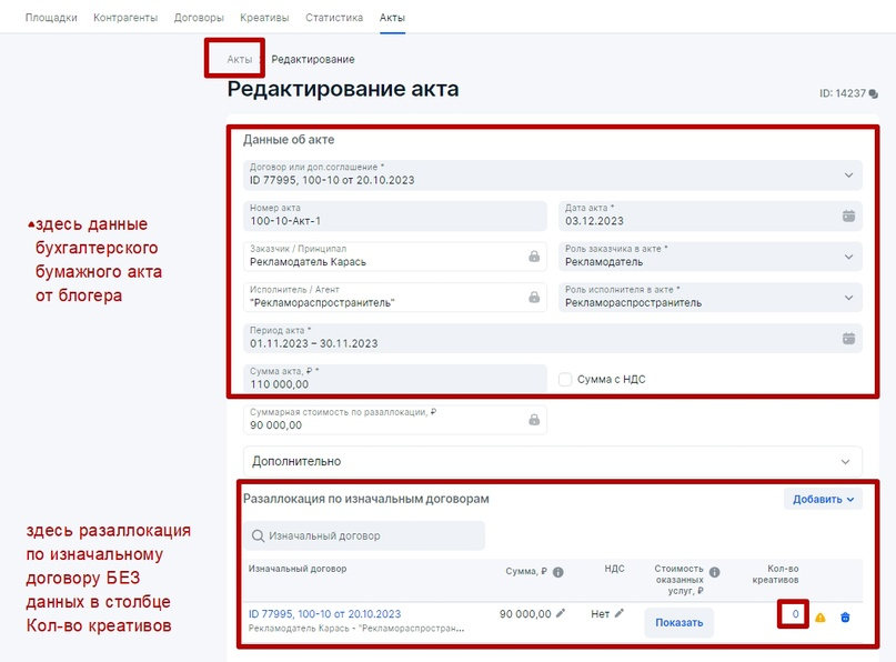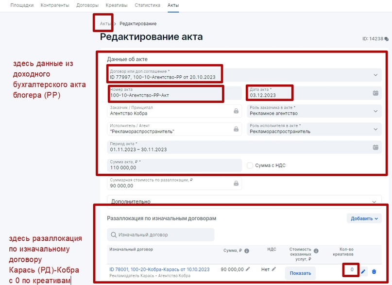 После окончания размещения РИМ, блогер должен оформить и передать Посреднику (рекламное агентство Кобра) бумажные акты. А также занести атрибуты бухгалтерского акта в ОРД в блоке Акты с разаллокацией по Изначальному договору (Рекламодатель Карась — Агентство Кобра) и занести данные по показам в блоке Статистика с разаллокациями по креативам (площадкам).