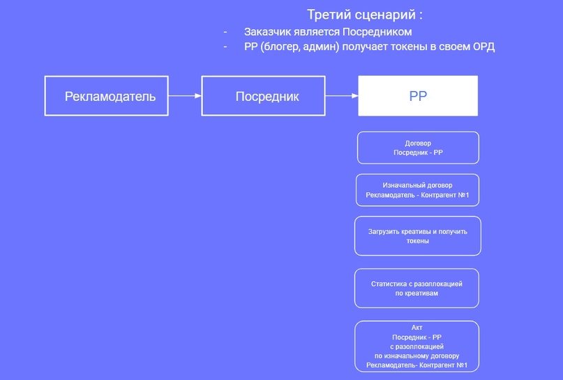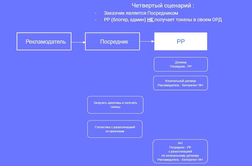 Изначальным договором теперь будет считаться договор между РД и Посредником, так как именно Посредник (рекламное агентство, биржа, рекламная платформа Яндекс Директ либо рекламна яплатформа ВК реклама) теперь будет являться Контрагентом №1 для Рекламодателя, а не РР, в отличие от короткой цепочки РД-РР по первому и второму сценарию.