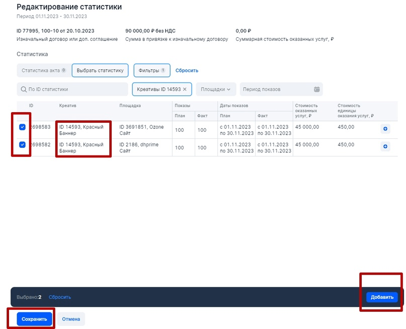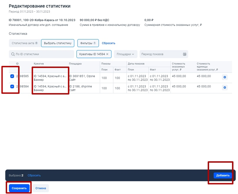 В нижнем блоке (блок разаллокации по Изначальному договору) блогер сначала выберет Изначальный договор (как указано выше, в нашем случае Изначальный договор и договор РД-РР это одно и тоже) укажет сумму 90 000 рублей, так как именно она была потрачена непосредственно на размещение рекламных материалов. Затем укажет НДС либо нет, а далее нажмет Сохранить. В итоге, в интерфейсе появится Карандашик в столбце Количество креативов, при нажатии на который, откроется блок Статистика, где можно выбрать наш креатив, который был размещен на двух площадках: