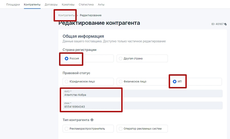 РР (блогер) в своем ОРД надо завести Посредника в блоке Контрагенты. Пусть это будет рекламное агентство Кобра:
