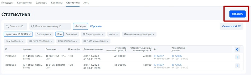 Сначала следует оформить блок Статистика, в котором РР занесет данные по показам для каждого креатива и для каждой площадки. Так как у нас креатив был один, то в блоке Статистика будет присутствовать две строчки — каждая для своей площадки. Итак, в блоке Статистика нажмем Добавить и поэтапно добавим каждую площадку. Напомним, площадки размещения РИМ мы добавили в самом начале практической части и прикрепили их к РР (рекламораспространителю).