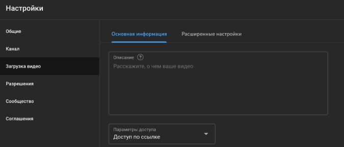 В другой подкатегории «Настроек», в «Загрузке видео», следует обязательно добавить описание (и теги, но они менее важны). Причём описание должно быть коротким — однострочным — потому что оно выводится на главной странице вашего канала. Используйте его с умом!