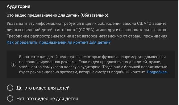 Открыв «Студию», переходим во вкладку «Контент» с левой стороны экрана и выбираем любое из ваших видео. Прокрутив немного вниз, вы доберетесь до «Аудитории», где YouTube спросит у вас: «Это видео предназначено для детей?» Этот момент важен по нескольким причинам.