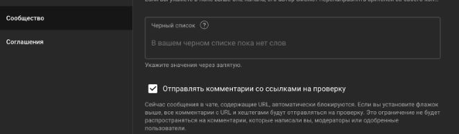 В «Настройках», во вкладке «Сообщество», есть возможность добавлять определённые слова в чёрный список. Вне зависимости от того детский у вас канал или нет, это полезная вещь. Во-первых, потому что большое количество нецензурных слов портит впечатление от вашего канала, а во-вторых, потому что, если вы почувствовали на себе атаку ботов, здесь вы можете вставить всё их сообщение в чёрный список и больше об этом не думать.