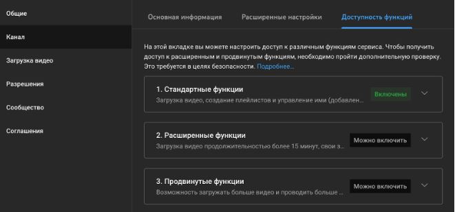 В том же разделе, во вкладке «Доступность функций», советуем подключить все представленные опции, чтобы иметь возможность создавать превью к своим роликам, которые, как вы уже наверняка знаете, совершенно необходимы для привлечения аудитории.