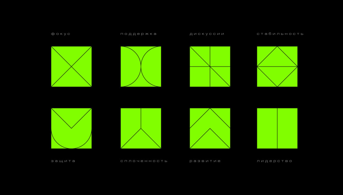 Для проекта был разработан кастомный шрифт с угловатыми линиями. Палитра фирменных цветов состоит из черного и кислотно-зеленого, подчёркивая идею динамичности и роста. Для контрастности мы добавили ярко-розовый оттенок.