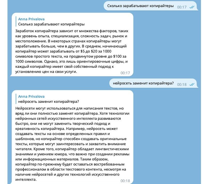 Анна приводит примеры ответов нейросети, которую попросили написать о профессии копирайтер.