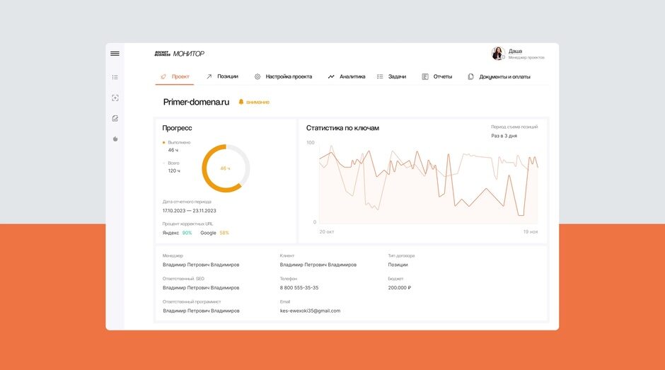 Менеджеру доступен просмотр и управление только теми проектами, за которые он отвечает. У него есть возможность мониторить позиции сайта, получать уведомления о технических ошибках и формировать отчеты с помощью функции выгрузки данных. Информация о проектах, находящихся в ведении других менеджеров, для него закрыта.