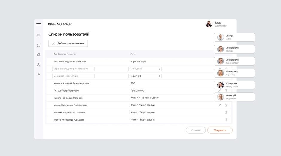 Кроме того, Супер-менеджер может создавать новые учетные записи пользователей, назначать ответственных на проектах и восстанавливать удаленные данные из архива.