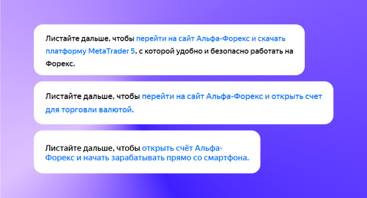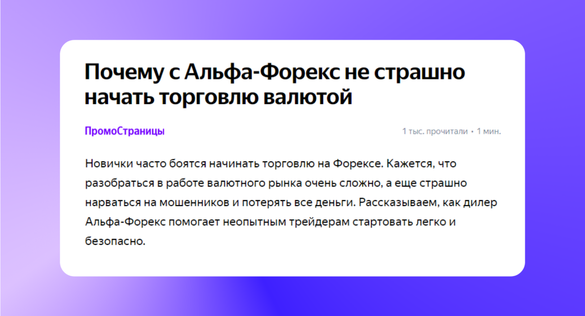 Мы делали ставку на теплую аудиторию, поэтому уже на этапе заголовка упоминали Альфа-Форекс. И не прогадали — такие заголовки показывали самые высокие CTR.