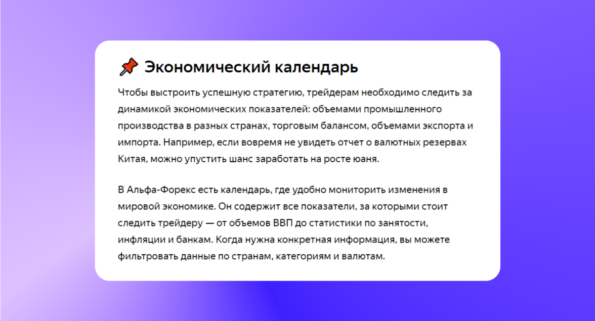 Хоть в заголовке и лиде мы большой акцент делали на бренде, но в тексте не уходили чисто в рекламу. Все статьи содержали полезную информации о рынке, прогнозировании курсов и работе платформы. Например, прежде чем говорить об конкретной функции Альфа-Форекс, мы объяснили, зачем в трейдинге следить за экономикой.