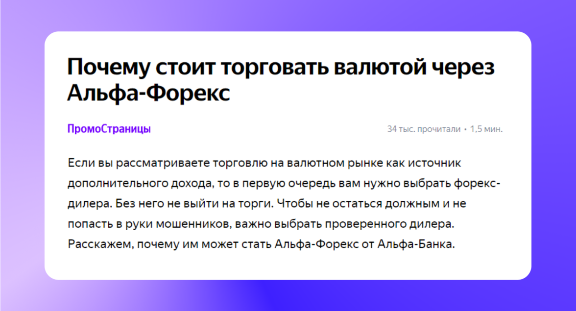 Через короткие рекламные форматы сложно отработать возражения, а вот с помощью продуктовых статей можно и доверие сформировать, и замотивировать открыть счет. Поэтому выбор пал на Яндекс ПромоСтраницы. Они показывают высокую вовлеченность пользователей по данным сервиса — в среднем каждый тратит 2 минуты на чтение, а 50% дочитавших переходят на сайт.
