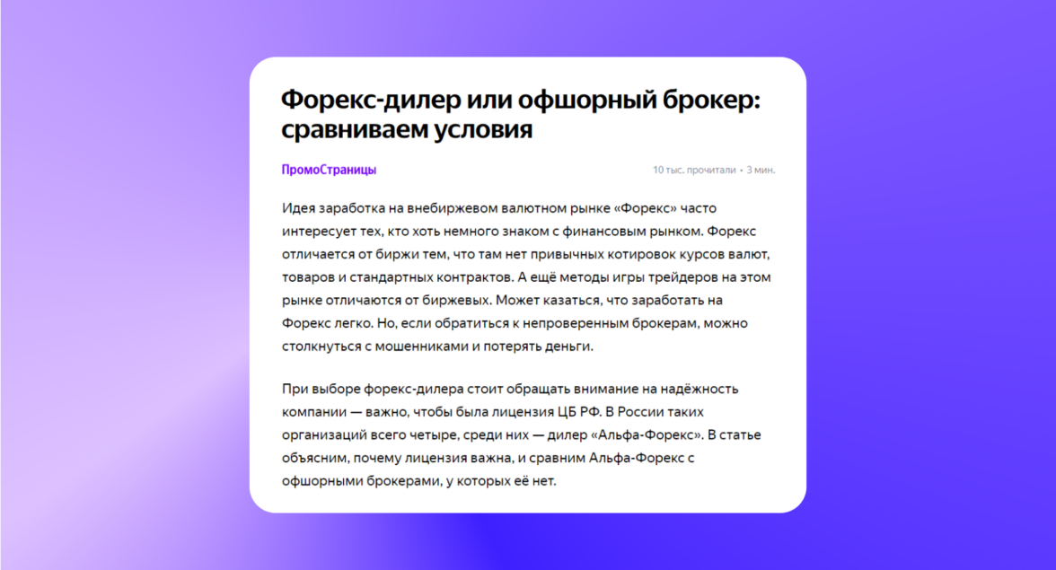 Мы пробовали разные форматы — сравнения, подборки, квизы и юзеркейсы. Для последнего даже задействовали команду продаж Альфа-Форекс. Они нам рассказывали истории реальных людей, а мы их обобщали и переносили в статьи. Личный опыт конкретного трейдера не могли использовать из-за высокого уровня конфиденциальности. Лучше всего отработали причины и сравнения с другими финансовыми инструментами.