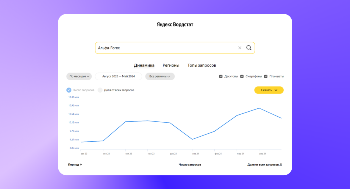 Динамика запросов в Яндекс Вордстат подтвердила результаты post-view отчета — с октября 2023 года по май 2024 года тренд положительный, единственное есть проседание в январе, но это влияние сезонности.