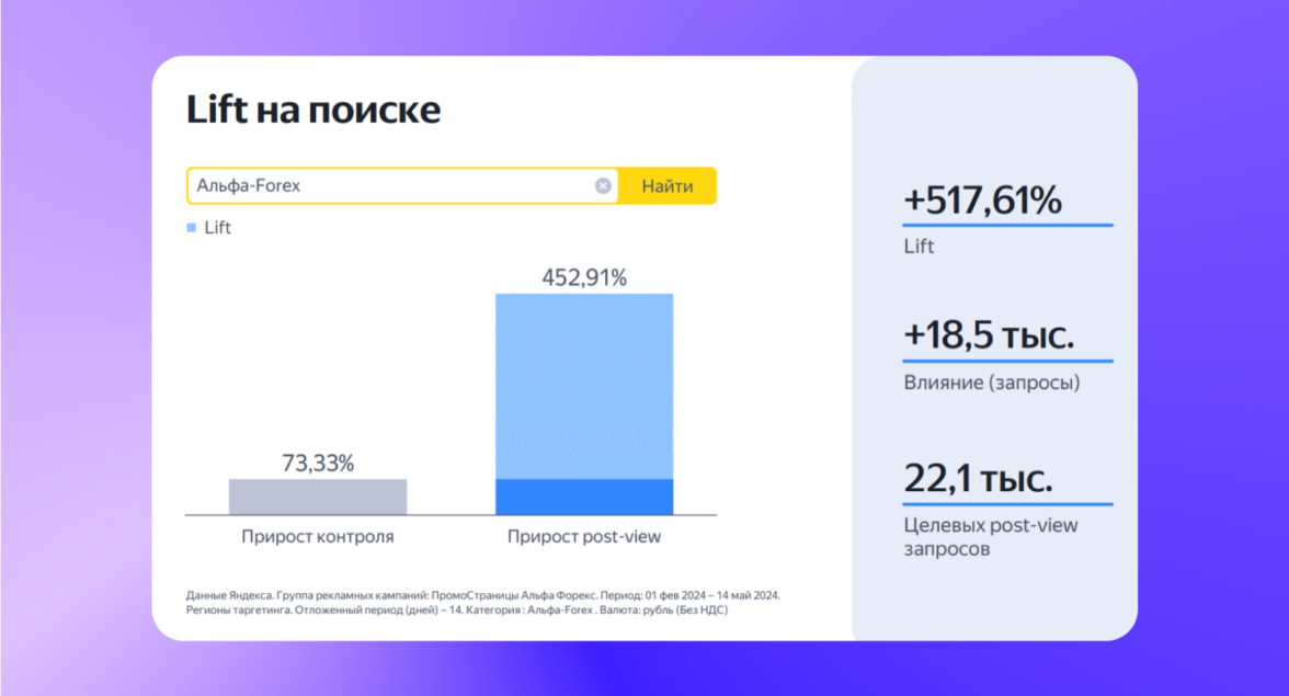 Чтобы оценить эффект от канала по взаимодействию пользователей с Альфа-Форекс, запросили у команды Яндекс ПромоСтраниц post-view отчет. Он показал значительный прирост брендовых запросов после прочтения наших статей — Lift на поиске составил 517%, а количество целевых запросов выросло на 18,5 тыс.