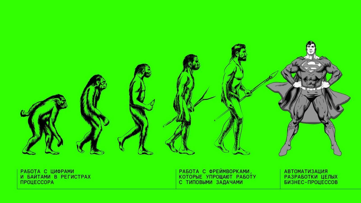 Переход к no-code разработке — лишь ещё один шаг в развитии средств разработки. Компьютерные технологии прошли эволюцию от работы с цифрами и байтами в регистрах процессора до фреймворков, которые упрощают работу с типовыми верхнеуровневыми задачами. Теперь же появилась возможность автоматизировать целые бизнес-процессы через «визуальное программирование». Эти технологии будут всё активнее развиваться.