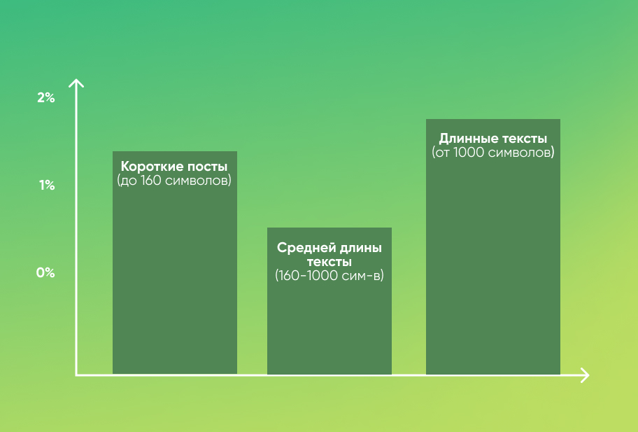 Что касается текстов, то большинство постов имеет среднюю длину (160–1000 символов), но вот сюрприз: именно длинные тексты собирают больше всего лайков и комментариев! Иногда стоит потратить пару минут на развёрнутый пост, чтобы создать настоящий отклик у аудитории. Короткие и средние тексты, конечно, работают, но если хотите зацепить — не бойтесь писать длинно и увлекательно!