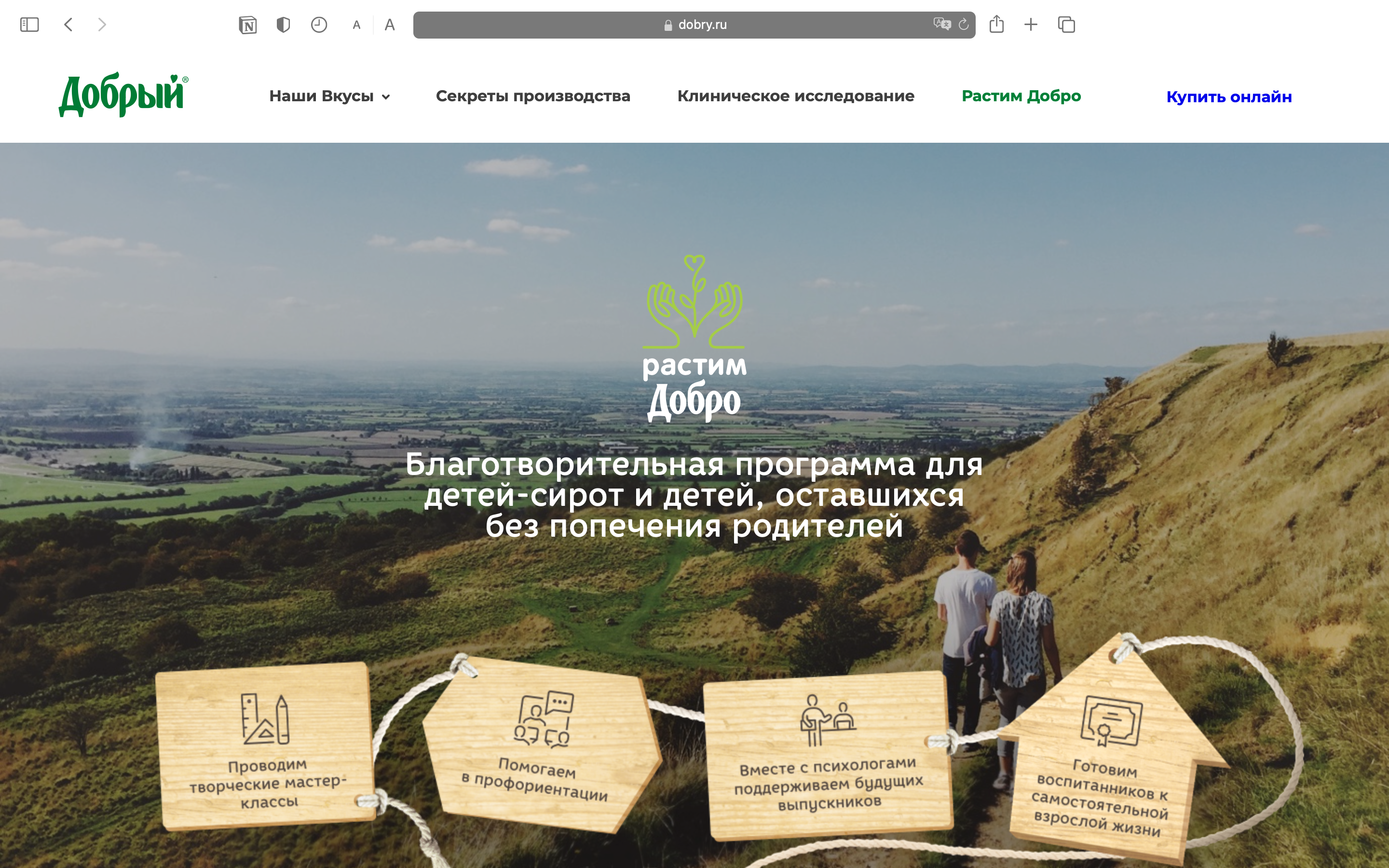 При этом «Добрый» — обязывающее название. Ведь нельзя называть себя добрым и не делать добрых дел. Поэтому в бренде ведется постоянная и большая работа в сфере благотворительности. Одной из благотворительных кампаний от компании «Мултон» является программа «Растим добро». Она направлена на помощь в адаптации детям-выпускникам детских домов. Проблематика не очевидна, но в реальности дети из детских домов встречаются с невероятными трудностями, оказавшись за стенами детского дома. Фонды апеллируют цифрой 10% благополучной жизни по прошествии 10 лет.