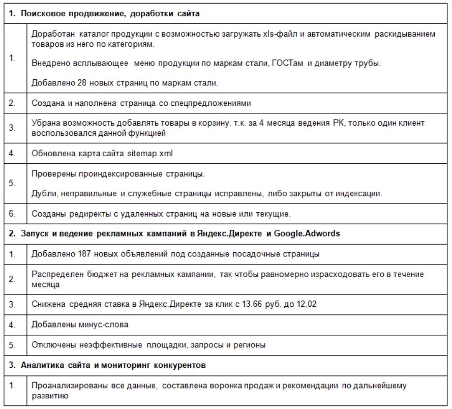 Что касается показателей, то они будут следующими:- ROMI (объяснение, как компания окупила затраты на маркетинг);- заявки (в шт и в %);- стоимость заявки (в руб и в динамике);- качество заявок (холодные и теплые, целевые и нецелевые клиенты);- LTV (расчет, сколько компания получит и сколько может потратить на привлечение клиентов).