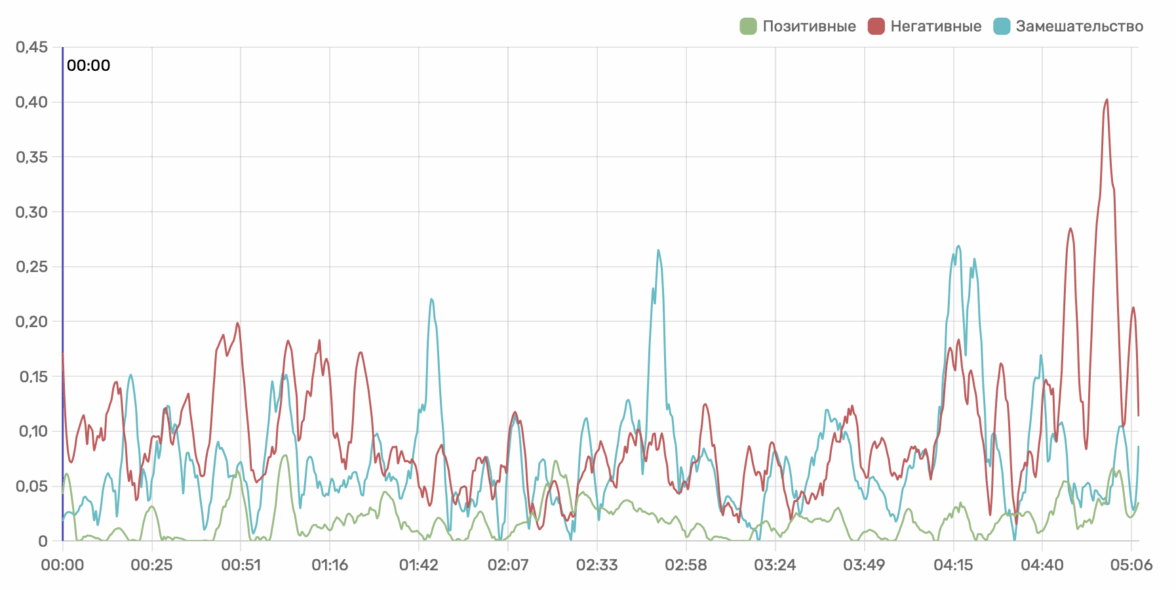 Анализ этого ролика на платформе AICAP показал, что зрители испытывали в основном негативные эмоции (53%) и замешательство (37%). Из базовых эмоций, распознаваемых нейросетью, к негативным эмоциям относятся злость, страх и отвращение, к позитивным — счастье и удивление. Ниже вы видите график сгруппированных эмоций во время просмотра ролика.
