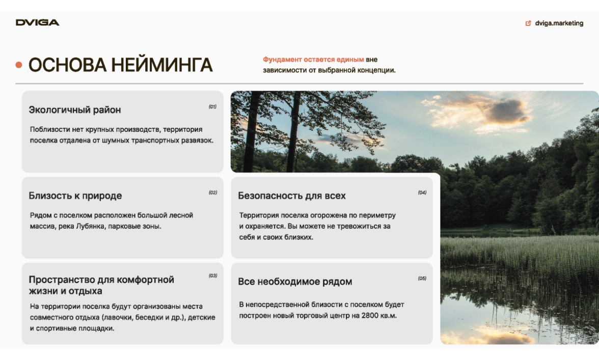 • Сильные и слабые стороны — взгляд со стороны позволил нам понять, какие у ЖК есть слабые и сильные стороны, что мы можем использовать в нейминге и маркетинге, а чего брать не стоит. Мы посмотрели на проект не только как разработчики нейминга, но и как его жители.