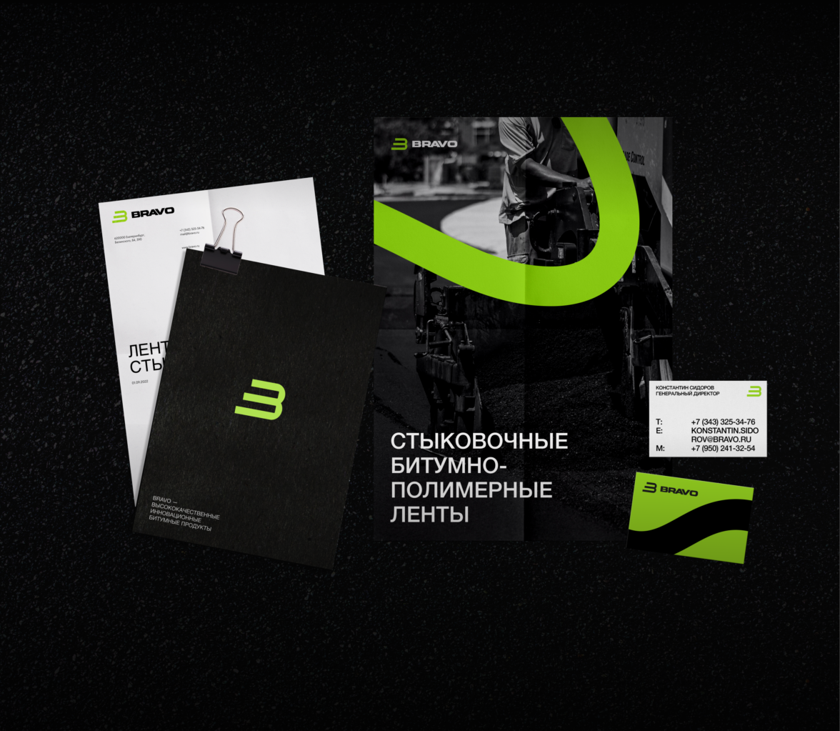 Визаульная айдентика брутальный ниши. образ гибкой битумной лента используется как в образе логотипа, так и в качестве графического элемента, который на разных фирменных носителях