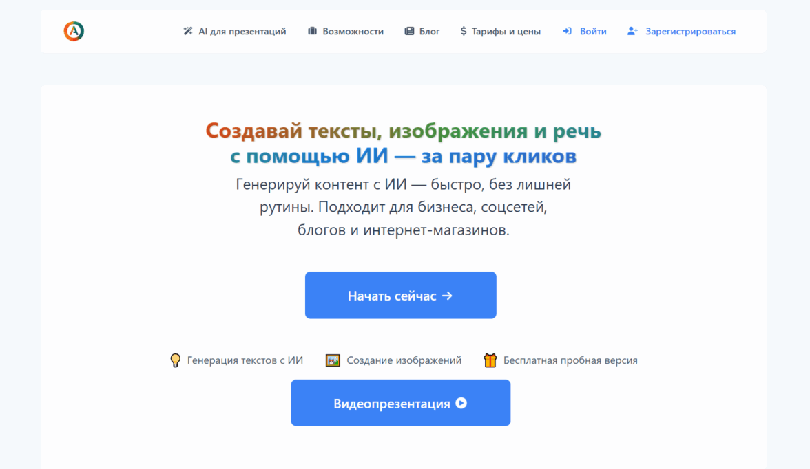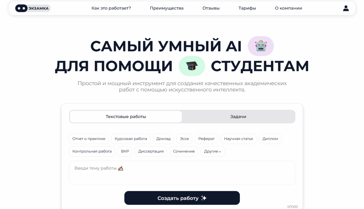 Функции: генерация текстовых работ, решение задач, подготовка к экзаменам, создание презентаций, проверка на уникальность
