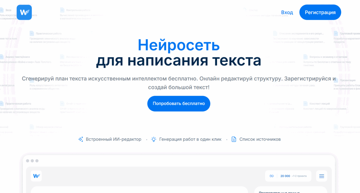 Функции: генерация текстов на базе GPT, интеграция источников, помощь в заочных работах, редактирование